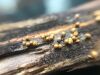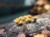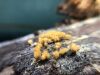 Man pēkšņi radās ideja - vai tur bija nu ļoti mitrs mikroklimats, egle ar melnalksni? Hipotētiski tādas dzeltenas var būt Diachea muscorum. Te bilde ir mazliet līdzīga: https://fr.wikipedia.org/wiki/Fichier:Craterium_muscorum,_Trawscoed,_North_Wales,_Aug_2016_-_Flickr_-_janetgraham84.jpg