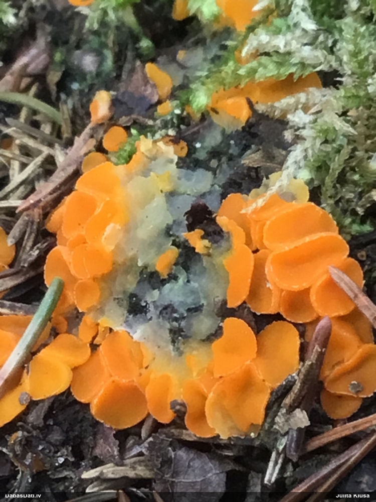 Priekš aurantiaca galīgi neatbilst jaunu augļķermeņu krāsa (kam sākumā jābūt zaļgani dzelteniem). Variants ir C.intricata, bet te mikroskopijā grūti saskatīt brīvo galu skaitu mezglos, tāpēc ātrumā droši noteikt nevaru.