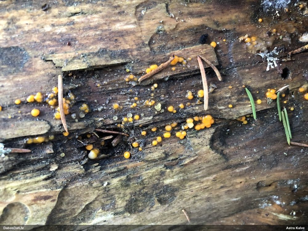 Man pēkšņi radās ideja - vai tur bija nu ļoti mitrs mikroklimats, egle ar melnalksni? Hipotētiski tādas dzeltenas var būt Diachea muscorum. Te bilde ir mazliet līdzīga: https://fr.wikipedia.org/wiki/Fichier:Craterium_muscorum,_Trawscoed,_North_Wales,_Aug_2016_-_Flickr_-_janetgraham84.jpg