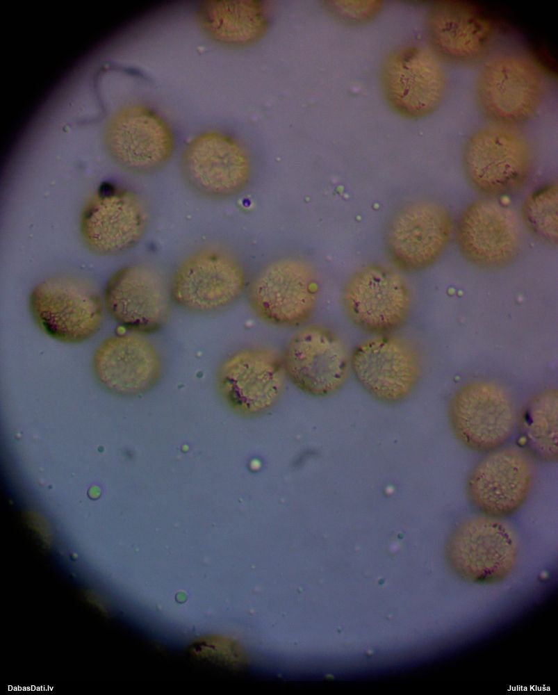 Paldies, Raivo! Ar acu gaišumu man arvien sliktāk, bet mikroskops palīdz. Jā, gribēju teikt, ka paraugam, ja vien nav kāda jutīga atradne, kurai drīkst ievākt tikai mazu gabaliņu, vērts ievākt lielāku gabalu, jo gļotsēnēm patīk kompānija. Un mikroskopa mazajos palielinājumos ar sānu papildus apgaismojumu ir vērts rūpīgi "izstaigāt" visu paraugu. Arī ķērpjus un interesantas sīksēnītes tā var atrast, ko dabā nepamanītu. Ar kriksītēm ir dažādi - pirmās es tā arī tikai citu sugu paraugos pamanīju, bet vēlāk redzēju arī dabā kriskīšu plantācijas - ja to ir daudz, tad var pamanīt jau dabā. Uz sūnām gan ir ekstrēms gadījums, dabā droši nepamanītu, arī eksemplāra noņemšana no sūnas nebija pārāk veiksmīga, tāpēc par noteikšanu mazliet šaubos (sporām mazliet cits tonis). Bet pagaidām citas hipotēzes nav (un konkrētā eksemplāra arī vairs ne).