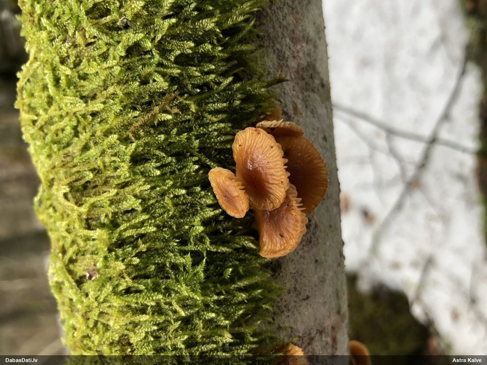 Ja uz beigta koka, tad ticamākā laikam ir B.affinis var. microspora, lai gan tā aug uz mizas. Bet varbūt tieši apakšā gļotsēnēm ir kādi mizas fragmentiņi?