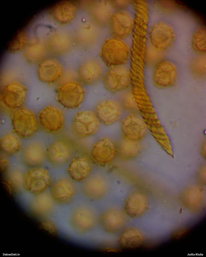 Paldies, Raivo! Ar acu gaišumu man arvien sliktāk, bet mikroskops palīdz. Jā, gribēju teikt, ka paraugam, ja vien nav kāda jutīga atradne, kurai drīkst ievākt tikai mazu gabaliņu, vērts ievākt lielāku gabalu, jo gļotsēnēm patīk kompānija. Un mikroskopa mazajos palielinājumos ar sānu papildus apgaismojumu ir vērts rūpīgi "izstaigāt" visu paraugu. Arī ķērpjus un interesantas sīksēnītes tā var atrast, ko dabā nepamanītu. Ar kriksītēm ir dažādi - pirmās es tā arī tikai citu sugu paraugos pamanīju, bet vēlāk redzēju arī dabā kriskīšu plantācijas - ja to ir daudz, tad var pamanīt jau dabā. Uz sūnām gan ir ekstrēms gadījums, dabā droši nepamanītu, arī eksemplāra noņemšana no sūnas nebija pārāk veiksmīga, tāpēc par noteikšanu mazliet šaubos (sporām mazliet cits tonis). Bet pagaidām citas hipotēzes nav (un konkrētā eksemplāra arī vairs ne).