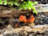 Man pēkšņi radās ideja - vai tur bija nu ļoti mitrs mikroklimats, egle ar melnalksni? Hipotētiski tādas dzeltenas var būt Diachea muscorum. Te bilde ir mazliet līdzīga: https://fr.wikipedia.org/wiki/Fichier:Craterium_muscorum,_Trawscoed,_North_Wales,_Aug_2016_-_Flickr_-_janetgraham84.jpg