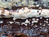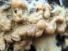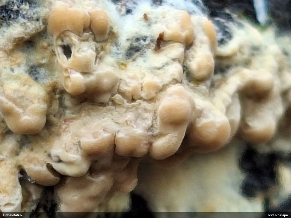 Paldies par paraugu! Paraugā augļķermeņi gan bija ļoti cieti, līdz galam nenobrieduši. Jauna eksemplāra krāsa var būt nozīmīga noteikšanā, bet svarīgi arī nobriedināt (turot mitrākā vietā), citādi perīdiju noņemt mikroskopēšanai ir praktiski neiespējami. Šajā gadījumā mazu gabaliņu izdevās atmiekšķēt un nodabūt, kas sarežģītākos gadījumos varētu būt nepietiekami. Pēc izmēra un perīdija pazīmēm te varētu būt divi varianti L.irregularis un L.epidendrum, kas esot viens no grūtāk atšķiramajiem sugu pāriem. L.epidendrum vairāk raksturīgi, kā es tos saucu, pārstaipi uz augļķermeņa virsmas, kas te ir ļoti labi redzami, tāpēc izšķīros par parastāko sugu.