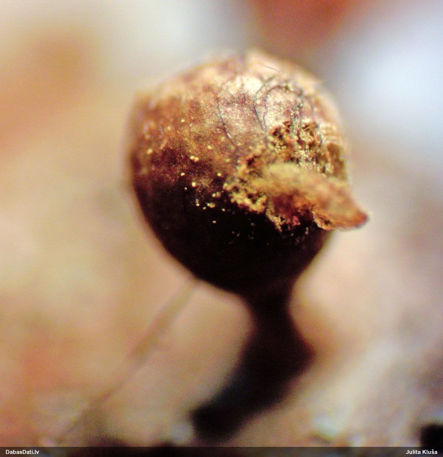 Paldies, Raivo! Ar acu gaišumu man arvien sliktāk, bet mikroskops palīdz. Jā, gribēju teikt, ka paraugam, ja vien nav kāda jutīga atradne, kurai drīkst ievākt tikai mazu gabaliņu, vērts ievākt lielāku gabalu, jo gļotsēnēm patīk kompānija. Un mikroskopa mazajos palielinājumos ar sānu papildus apgaismojumu ir vērts rūpīgi "izstaigāt" visu paraugu. Arī ķērpjus un interesantas sīksēnītes tā var atrast, ko dabā nepamanītu. Ar kriksītēm ir dažādi - pirmās es tā arī tikai citu sugu paraugos pamanīju, bet vēlāk redzēju arī dabā kriskīšu plantācijas - ja to ir daudz, tad var pamanīt jau dabā. Uz sūnām gan ir ekstrēms gadījums, dabā droši nepamanītu, arī eksemplāra noņemšana no sūnas nebija pārāk veiksmīga, tāpēc par noteikšanu mazliet šaubos (sporām mazliet cits tonis). Bet pagaidām citas hipotēzes nav (un konkrētā eksemplāra arī vairs ne).