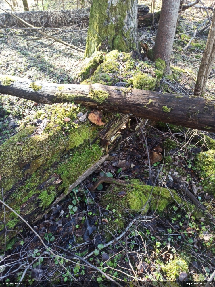Satrūdējusi kritala mežā, nav dēļi. Iespējams, egle, jauktu koku mežs.