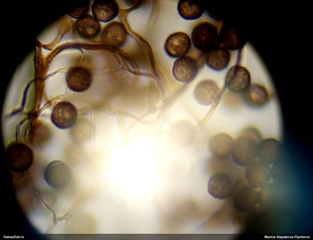 Sporas izskatās ļoti gaišas, varbūt nenobriedušas. Es laikam pēc kāda laiciņa mēģinātu vēlreiz mikroskopēt. Tajā pašā laikā sporu izmēri priekš T.contorta ir pamazi (ja tipiski ir 11-14 mkm, te ir knapi 11 mkm)