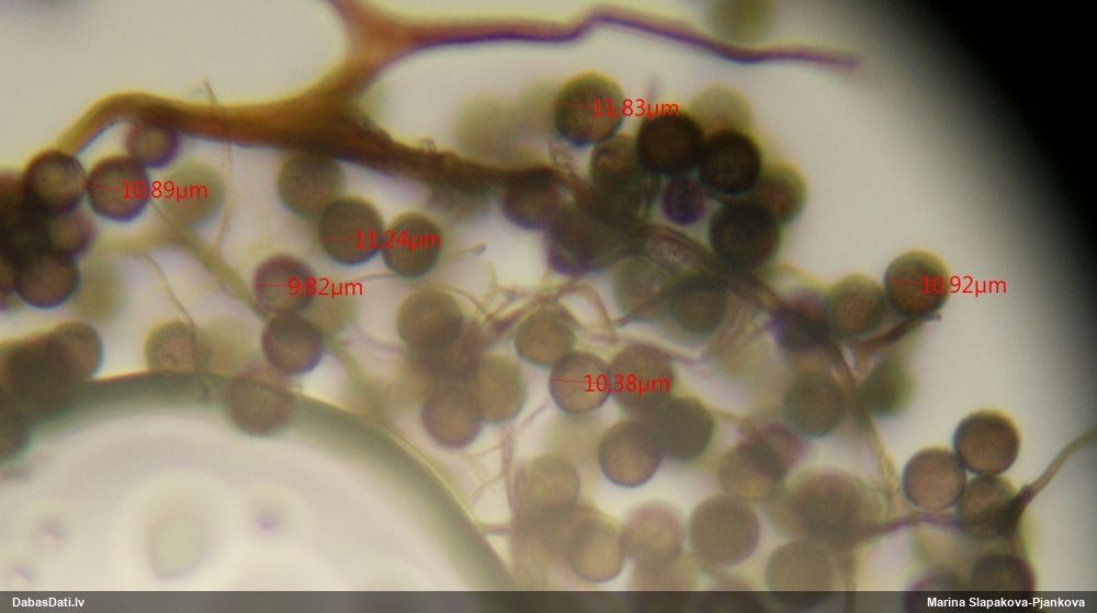 Sporas izskatās ļoti gaišas, varbūt nenobriedušas. Es laikam pēc kāda laiciņa mēģinātu vēlreiz mikroskopēt. Tajā pašā laikā sporu izmēri priekš T.contorta ir pamazi (ja tipiski ir 11-14 mkm, te ir knapi 11 mkm)