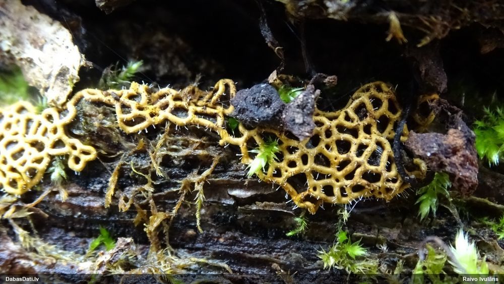 Man pēkšņi radās ideja - vai tur bija nu ļoti mitrs mikroklimats, egle ar melnalksni? Hipotētiski tādas dzeltenas var būt Diachea muscorum. Te bilde ir mazliet līdzīga: https://fr.wikipedia.org/wiki/Fichier:Craterium_muscorum,_Trawscoed,_North_Wales,_Aug_2016_-_Flickr_-_janetgraham84.jpg