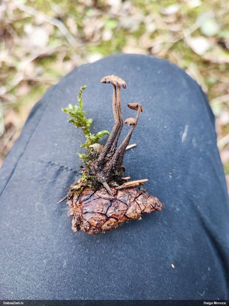 Vai tik nebūs medainā bumbulīte? Augļķermeņi vertikāli izstiepti, sporu mākonis ciešā klājienā.
