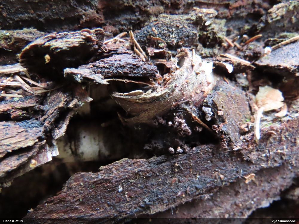 Šis interesants. Uz sausām priedes kritalām rozā mazi līdzīga izskata augļķermeņi maijā aug divām citādi atšķirīgām sugām (dažādās dzimtās) - melnajai plaispikai Amaurochaete atra un trauslajam gļotpūpēdim Reticularia jurana. Pēc sīkām mikropazīmēm (foto nav redzama pat ne sīka balta pakāje ap augļķermeni, un uz virsmas ar lielu piepūli var ja ne saskatīt, tad iztēloties tīklotu virsmas rakstu) izšķīros par biežāko no abām - melno plaispiku, kas tipiski aug samērā atklātās, skrajās vietās, t.sk. nesenos izcirtumos.