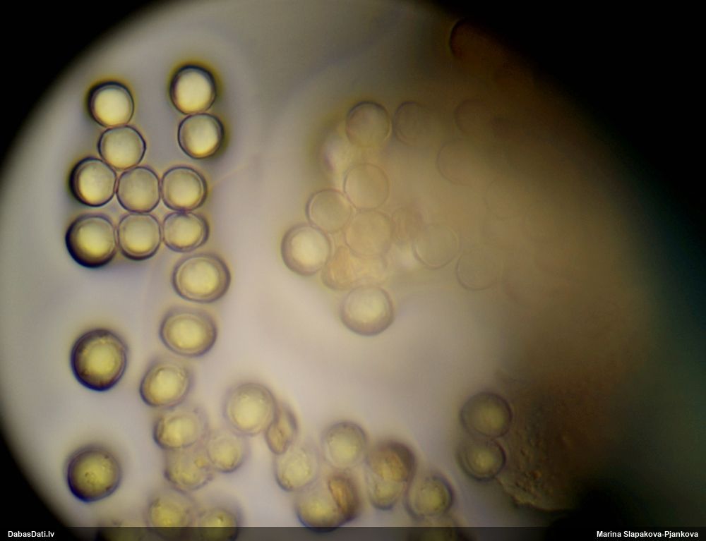 Šis man pašai sanāca pārsteigums. Ievācu paraugu ar domu "varbūt tur ir gļotsēne", dodot varbūtību apmēram pusprocentu, ka ir. Bet no mikroskopijas starp galīgi vecām sporām izdevās atrast ne tikai dažas labas, bet, galvenais, arī perfektus kapilīcija fragmentus, no kura suga, vēl kopā ar sporu pazīmēm, nosakāma nešaubīgi.