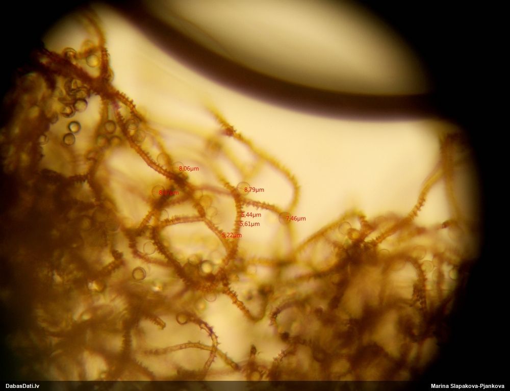 Šis man pašai sanāca pārsteigums. Ievācu paraugu ar domu "varbūt tur ir gļotsēne", dodot varbūtību apmēram pusprocentu, ka ir. Bet no mikroskopijas starp galīgi vecām sporām izdevās atrast ne tikai dažas labas, bet, galvenais, arī perfektus kapilīcija fragmentus, no kura suga, vēl kopā ar sporu pazīmēm, nosakāma nešaubīgi.