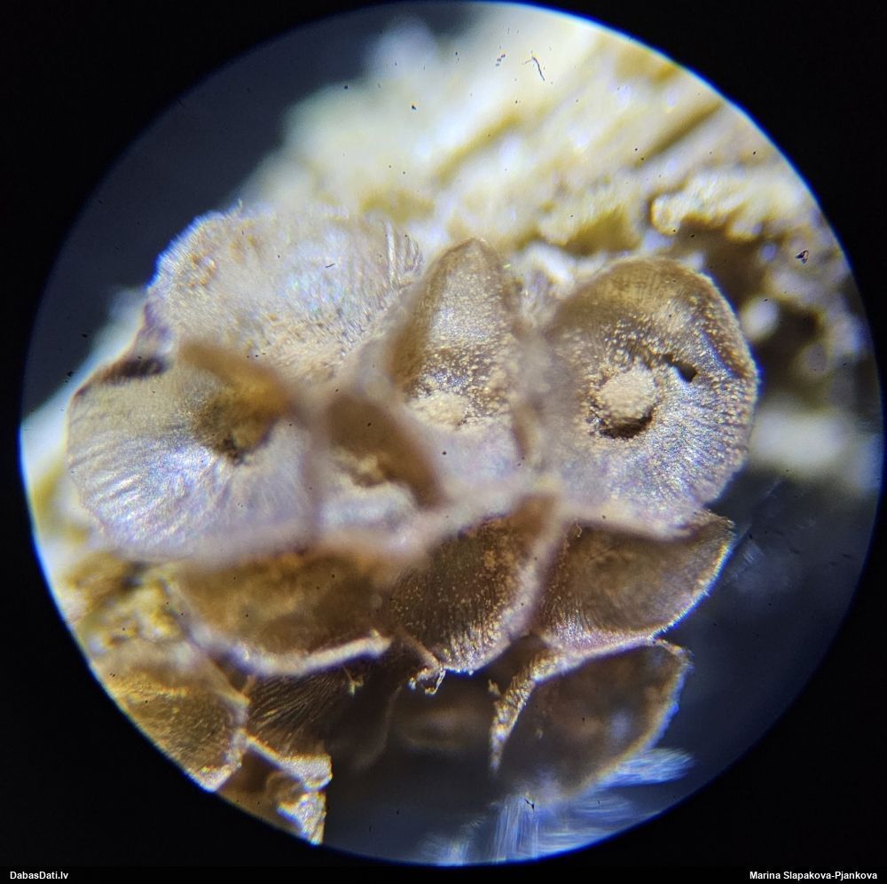 Paldies, Raivo! Ar acu gaišumu man arvien sliktāk, bet mikroskops palīdz. Jā, gribēju teikt, ka paraugam, ja vien nav kāda jutīga atradne, kurai drīkst ievākt tikai mazu gabaliņu, vērts ievākt lielāku gabalu, jo gļotsēnēm patīk kompānija. Un mikroskopa mazajos palielinājumos ar sānu papildus apgaismojumu ir vērts rūpīgi "izstaigāt" visu paraugu. Arī ķērpjus un interesantas sīksēnītes tā var atrast, ko dabā nepamanītu. Ar kriksītēm ir dažādi - pirmās es tā arī tikai citu sugu paraugos pamanīju, bet vēlāk redzēju arī dabā kriskīšu plantācijas - ja to ir daudz, tad var pamanīt jau dabā. Uz sūnām gan ir ekstrēms gadījums, dabā droši nepamanītu, arī eksemplāra noņemšana no sūnas nebija pārāk veiksmīga, tāpēc par noteikšanu mazliet šaubos (sporām mazliet cits tonis). Bet pagaidām citas hipotēzes nav (un konkrētā eksemplāra arī vairs ne).