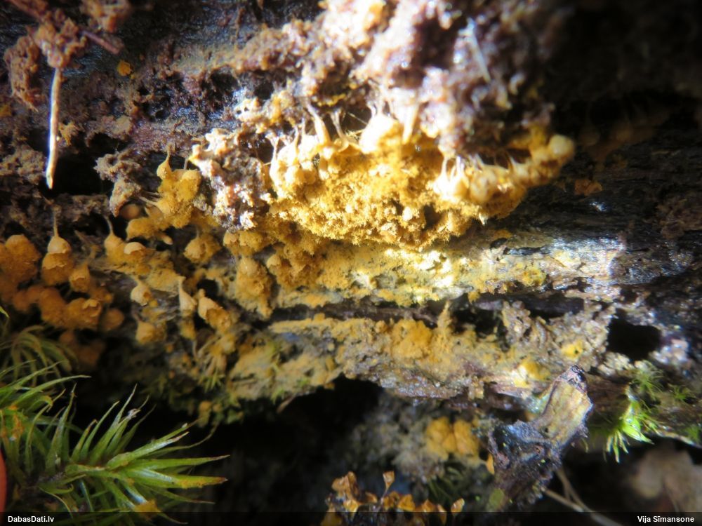 Man pēkšņi radās ideja - vai tur bija nu ļoti mitrs mikroklimats, egle ar melnalksni? Hipotētiski tādas dzeltenas var būt Diachea muscorum. Te bilde ir mazliet līdzīga: https://fr.wikipedia.org/wiki/Fichier:Craterium_muscorum,_Trawscoed,_North_Wales,_Aug_2016_-_Flickr_-_janetgraham84.jpg