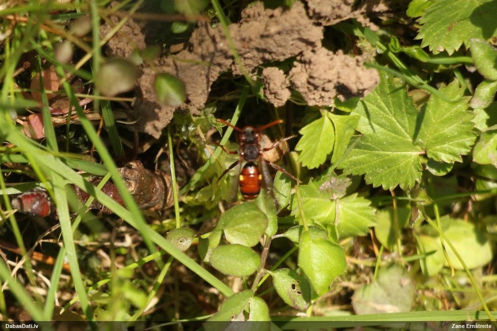 Jāredz tuvāk (kaut vai izkadrēts šis pats attēls) - varbūt tumšā eļļasvabole (Meloe proscarabaeus)