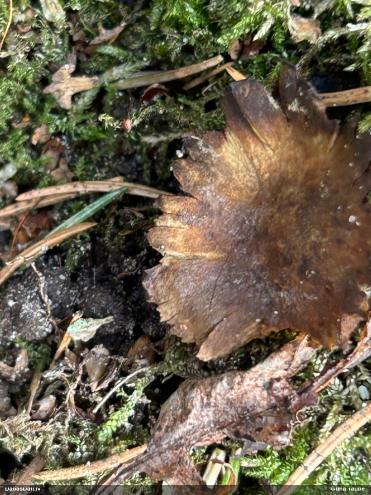 Nevar saprast, uz kā auga - vai tas ir nobirās, vai uz kritalas mizas? Abas hipotēzes ir "pa tēmu", bet man "nepatīk" kopskats, kur skaidri redzams, ka vairāki augļķermeņi ir cieši kopā, bet tas nav raksturīgs ne vienai, ne otrai hipotēzei, kur augļķermeņi tipiski ir nodalīti. Ļoti interesanti, ja ir paraugs, tad kāds tas izskatās tagad, un vispār to vajadzētu mikroskopēt.