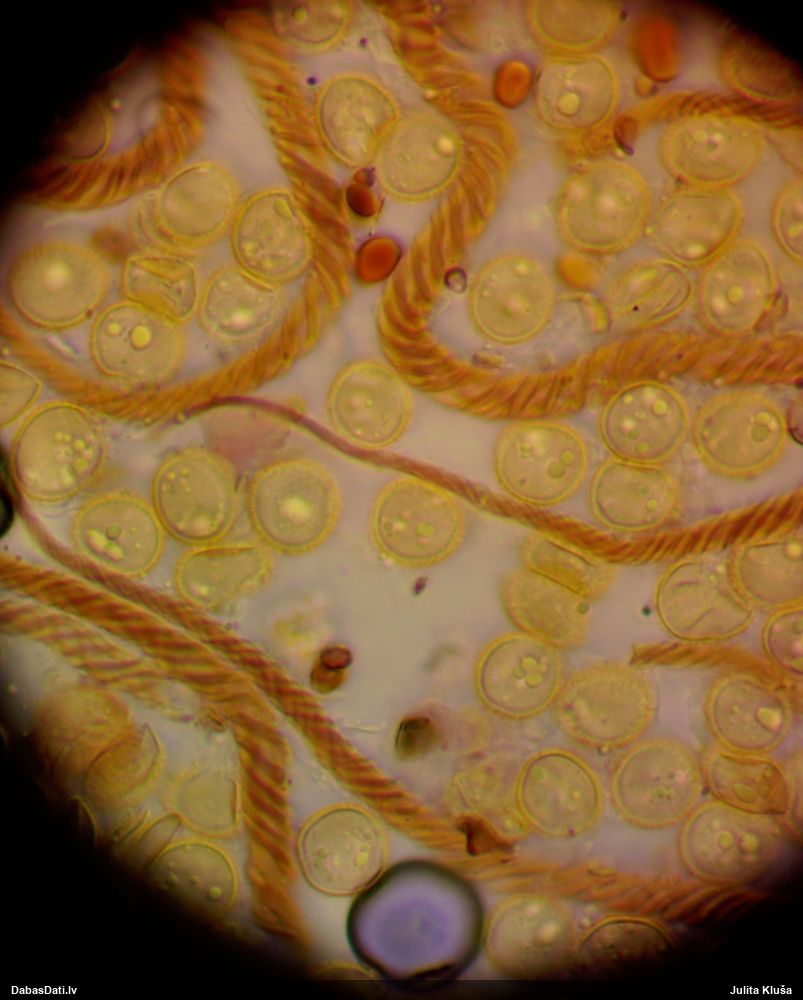 Sporas izskatās ļoti gaišas, varbūt nenobriedušas. Es laikam pēc kāda laiciņa mēģinātu vēlreiz mikroskopēt. Tajā pašā laikā sporu izmēri priekš T.contorta ir pamazi (ja tipiski ir 11-14 mkm, te ir knapi 11 mkm)