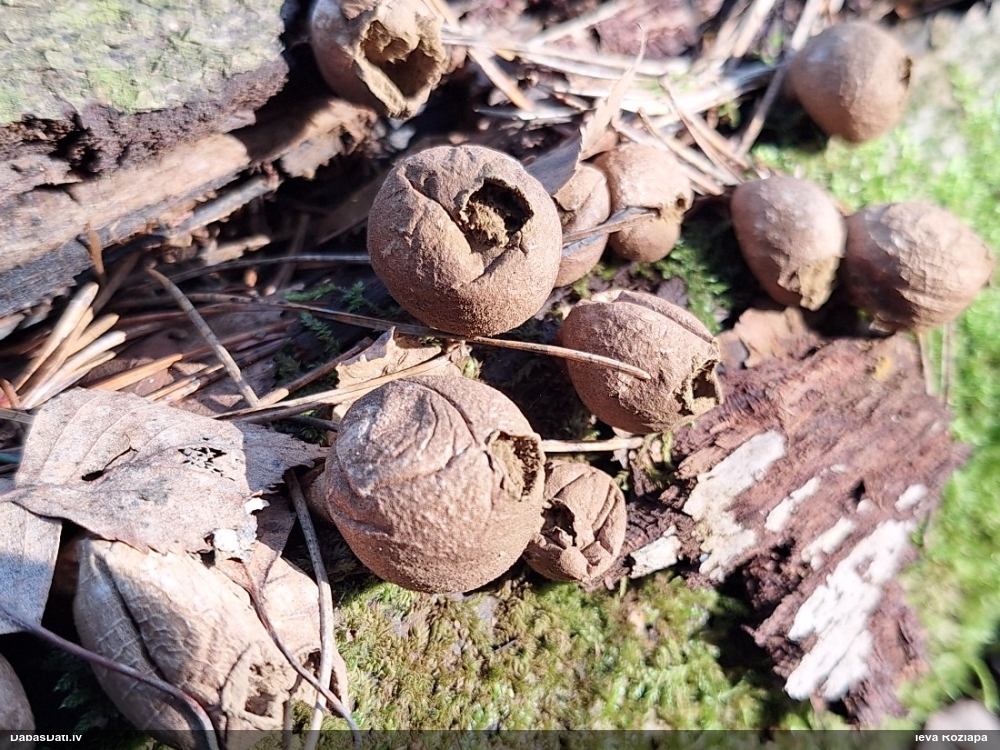 Izskatīju zinātnē aprakstītās Badhamia. Un Badhamiopsis. Tuvākā izskatās Badhamiopsis nivisimulans, kam raksturīgas ciešas grupas uz dzīviem kokiem (bet vai šis ir dzīvs?). Sporas līdzīgas, bet te raksturīgas arī dažas ļoti ovālas un lielas sporas, kādas foto neredz, bet varbūt ir? Un jābūt ar gaišu līniju pāri, to pagaidam neatradu. Bet tonis un kārpas līdzīgas. Izmēram būtu jabūt (10-)11-14 mkm vai ovālām garākām. Es teiktu, ka šai līdzīga, bet cita suga. Bet citu man piedāvājumā pagaidām nav. Pēdējā foto teiktu, ka sporas negrupējas, tad atkrīt B.juliae. Bet tikko pamanīju priekšpēdējo foto un tagad man nav pārliecības, grupējas vai nē.