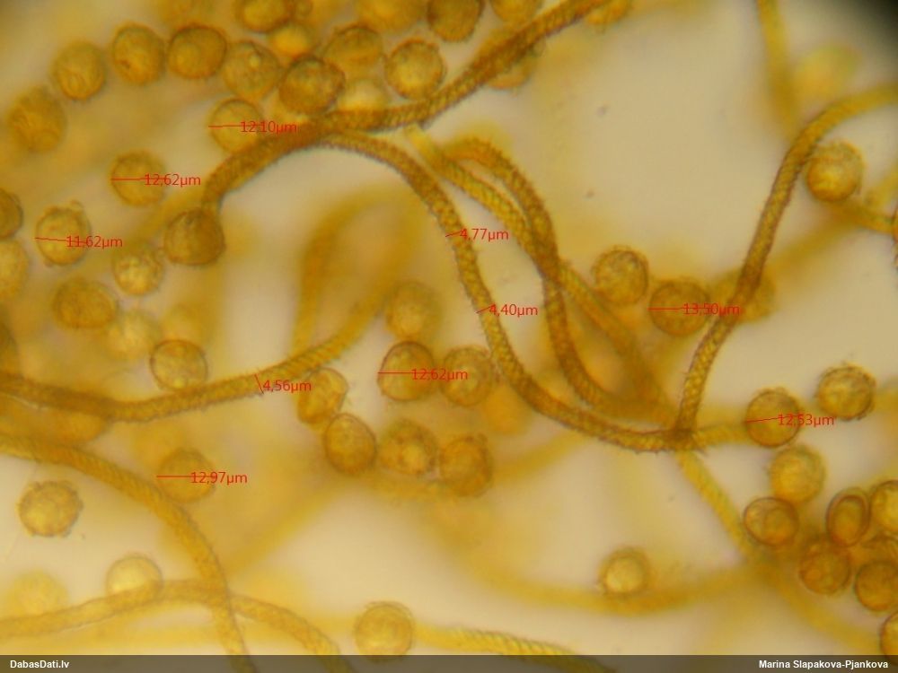 Šis man pašai sanāca pārsteigums. Ievācu paraugu ar domu "varbūt tur ir gļotsēne", dodot varbūtību apmēram pusprocentu, ka ir. Bet no mikroskopijas starp galīgi vecām sporām izdevās atrast ne tikai dažas labas, bet, galvenais, arī perfektus kapilīcija fragmentus, no kura suga, vēl kopā ar sporu pazīmēm, nosakāma nešaubīgi.