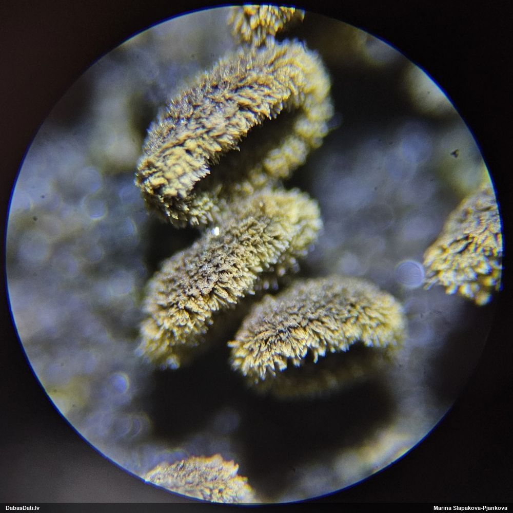 Šis man pašai sanāca pārsteigums. Ievācu paraugu ar domu "varbūt tur ir gļotsēne", dodot varbūtību apmēram pusprocentu, ka ir. Bet no mikroskopijas starp galīgi vecām sporām izdevās atrast ne tikai dažas labas, bet, galvenais, arī perfektus kapilīcija fragmentus, no kura suga, vēl kopā ar sporu pazīmēm, nosakāma nešaubīgi.