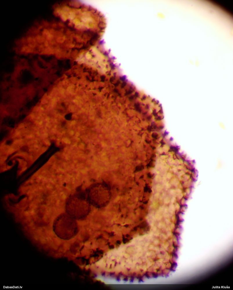 Paldies, Raivo! Ar acu gaišumu man arvien sliktāk, bet mikroskops palīdz. Jā, gribēju teikt, ka paraugam, ja vien nav kāda jutīga atradne, kurai drīkst ievākt tikai mazu gabaliņu, vērts ievākt lielāku gabalu, jo gļotsēnēm patīk kompānija. Un mikroskopa mazajos palielinājumos ar sānu papildus apgaismojumu ir vērts rūpīgi "izstaigāt" visu paraugu. Arī ķērpjus un interesantas sīksēnītes tā var atrast, ko dabā nepamanītu. Ar kriksītēm ir dažādi - pirmās es tā arī tikai citu sugu paraugos pamanīju, bet vēlāk redzēju arī dabā kriskīšu plantācijas - ja to ir daudz, tad var pamanīt jau dabā. Uz sūnām gan ir ekstrēms gadījums, dabā droši nepamanītu, arī eksemplāra noņemšana no sūnas nebija pārāk veiksmīga, tāpēc par noteikšanu mazliet šaubos (sporām mazliet cits tonis). Bet pagaidām citas hipotēzes nav (un konkrētā eksemplāra arī vairs ne).