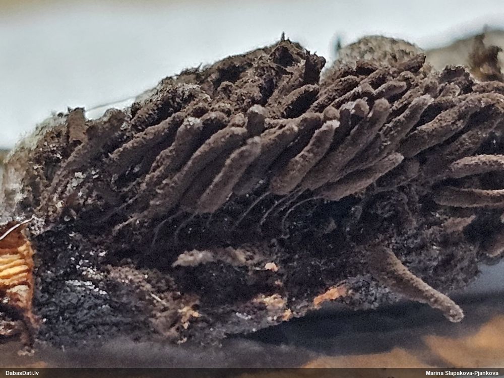 Šis man pašai sanāca pārsteigums. Ievācu paraugu ar domu "varbūt tur ir gļotsēne", dodot varbūtību apmēram pusprocentu, ka ir. Bet no mikroskopijas starp galīgi vecām sporām izdevās atrast ne tikai dažas labas, bet, galvenais, arī perfektus kapilīcija fragmentus, no kura suga, vēl kopā ar sporu pazīmēm, nosakāma nešaubīgi.