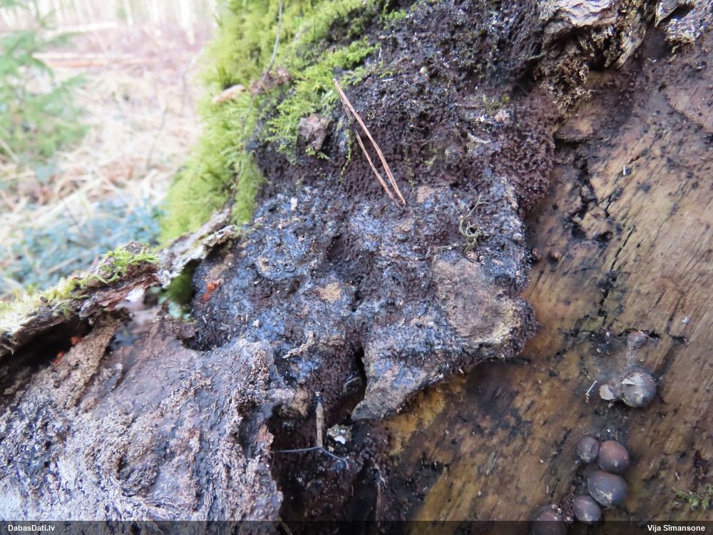 Liels paldies par paraugu! Mikroskopēju, viss kārtībā, kapilīcijs ir un suga pareiza. :) Un kā jau ir gadījies - tikko saņemu un apskatu paraugu, tā uzreiz ekspedīcijā izdodas atrast arī pašai (1 gab. augļķermeni :D). Ir pilnīgi droši, Raivo, bez Tava atraduma es arī nebūtu atradusi, jo uzmanību pievērsu, ka egle bija tieši tāda pati - slīpa un melna, tāpēc īpašs paldies par biotopa un substrāta bildēm! Kad ieraudzīju koka atbilstību, tad meklēju, kamēr atradu. :)