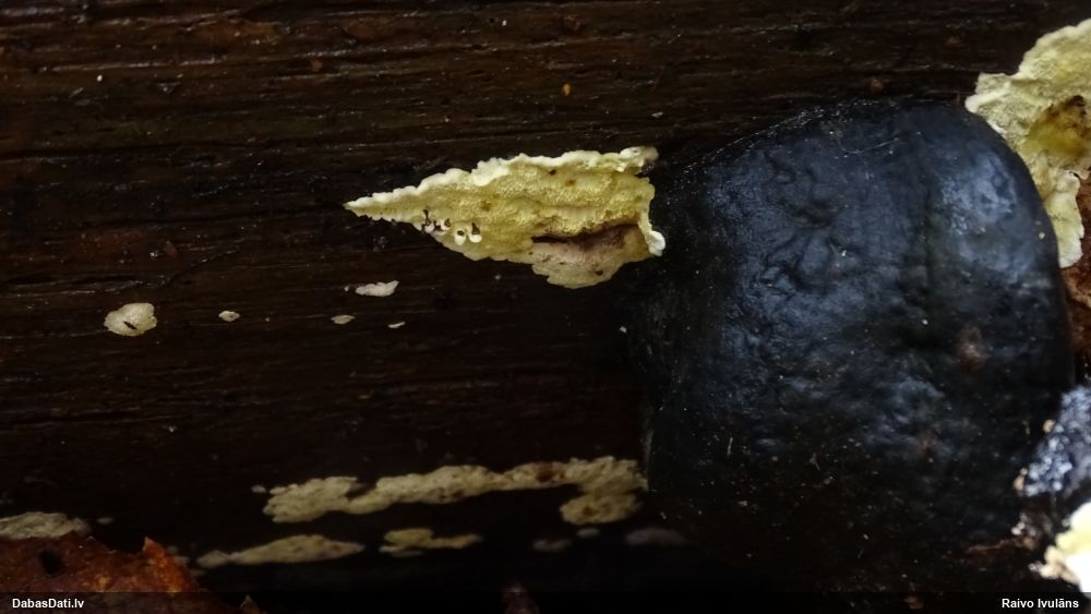 Šobrīd varu iedomāties 2 variantus - melnā plaispika Amaurochaete atra vai parastais gļotpūpēdis Reticularia lycoperdon. Pēc izmēra, augšanas laika un augšanas uz apstrādāta koka atbilst abas.
