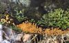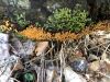 Man pēkšņi radās ideja - vai tur bija nu ļoti mitrs mikroklimats, egle ar melnalksni? Hipotētiski tādas dzeltenas var būt Diachea muscorum. Te bilde ir mazliet līdzīga: https://fr.wikipedia.org/wiki/Fichier:Craterium_muscorum,_Trawscoed,_North_Wales,_Aug_2016_-_Flickr_-_janetgraham84.jpg