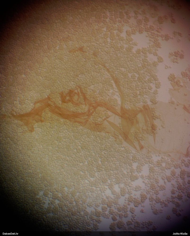 Paldies, Raivo! Ar acu gaišumu man arvien sliktāk, bet mikroskops palīdz. Jā, gribēju teikt, ka paraugam, ja vien nav kāda jutīga atradne, kurai drīkst ievākt tikai mazu gabaliņu, vērts ievākt lielāku gabalu, jo gļotsēnēm patīk kompānija. Un mikroskopa mazajos palielinājumos ar sānu papildus apgaismojumu ir vērts rūpīgi "izstaigāt" visu paraugu. Arī ķērpjus un interesantas sīksēnītes tā var atrast, ko dabā nepamanītu. Ar kriksītēm ir dažādi - pirmās es tā arī tikai citu sugu paraugos pamanīju, bet vēlāk redzēju arī dabā kriskīšu plantācijas - ja to ir daudz, tad var pamanīt jau dabā. Uz sūnām gan ir ekstrēms gadījums, dabā droši nepamanītu, arī eksemplāra noņemšana no sūnas nebija pārāk veiksmīga, tāpēc par noteikšanu mazliet šaubos (sporām mazliet cits tonis). Bet pagaidām citas hipotēzes nav (un konkrētā eksemplāra arī vairs ne).