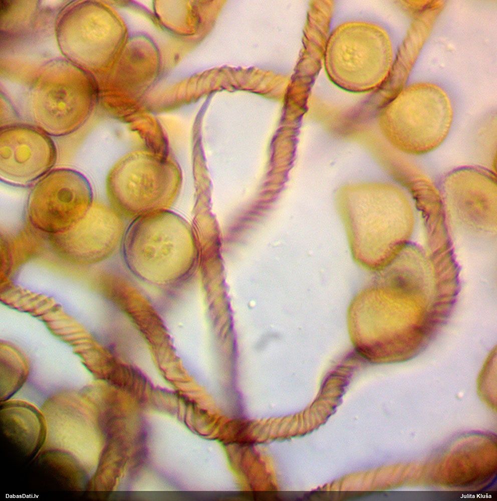 Šis man pašai sanāca pārsteigums. Ievācu paraugu ar domu "varbūt tur ir gļotsēne", dodot varbūtību apmēram pusprocentu, ka ir. Bet no mikroskopijas starp galīgi vecām sporām izdevās atrast ne tikai dažas labas, bet, galvenais, arī perfektus kapilīcija fragmentus, no kura suga, vēl kopā ar sporu pazīmēm, nosakāma nešaubīgi.