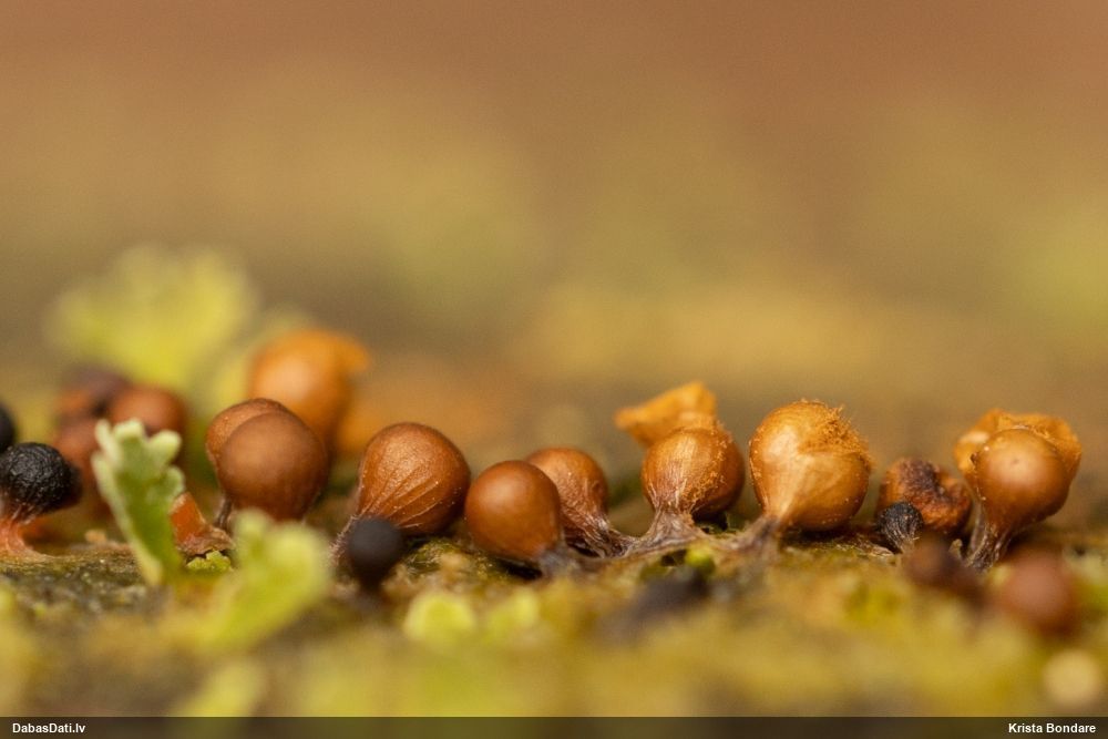 Paldies, Raivo! Ar acu gaišumu man arvien sliktāk, bet mikroskops palīdz. Jā, gribēju teikt, ka paraugam, ja vien nav kāda jutīga atradne, kurai drīkst ievākt tikai mazu gabaliņu, vērts ievākt lielāku gabalu, jo gļotsēnēm patīk kompānija. Un mikroskopa mazajos palielinājumos ar sānu papildus apgaismojumu ir vērts rūpīgi "izstaigāt" visu paraugu. Arī ķērpjus un interesantas sīksēnītes tā var atrast, ko dabā nepamanītu. Ar kriksītēm ir dažādi - pirmās es tā arī tikai citu sugu paraugos pamanīju, bet vēlāk redzēju arī dabā kriskīšu plantācijas - ja to ir daudz, tad var pamanīt jau dabā. Uz sūnām gan ir ekstrēms gadījums, dabā droši nepamanītu, arī eksemplāra noņemšana no sūnas nebija pārāk veiksmīga, tāpēc par noteikšanu mazliet šaubos (sporām mazliet cits tonis). Bet pagaidām citas hipotēzes nav (un konkrētā eksemplāra arī vairs ne).