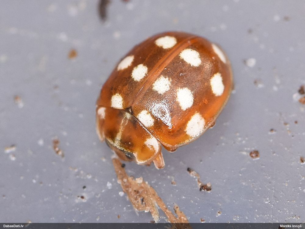 Izskatīju zinātnē aprakstītās Badhamia. Un Badhamiopsis. Tuvākā izskatās Badhamiopsis nivisimulans, kam raksturīgas ciešas grupas uz dzīviem kokiem (bet vai šis ir dzīvs?). Sporas līdzīgas, bet te raksturīgas arī dažas ļoti ovālas un lielas sporas, kādas foto neredz, bet varbūt ir? Un jābūt ar gaišu līniju pāri, to pagaidam neatradu. Bet tonis un kārpas līdzīgas. Izmēram būtu jabūt (10-)11-14 mkm vai ovālām garākām. Es teiktu, ka šai līdzīga, bet cita suga. Bet citu man piedāvājumā pagaidām nav. Pēdējā foto teiktu, ka sporas negrupējas, tad atkrīt B.juliae. Bet tikko pamanīju priekšpēdējo foto un tagad man nav pārliecības, grupējas vai nē.
