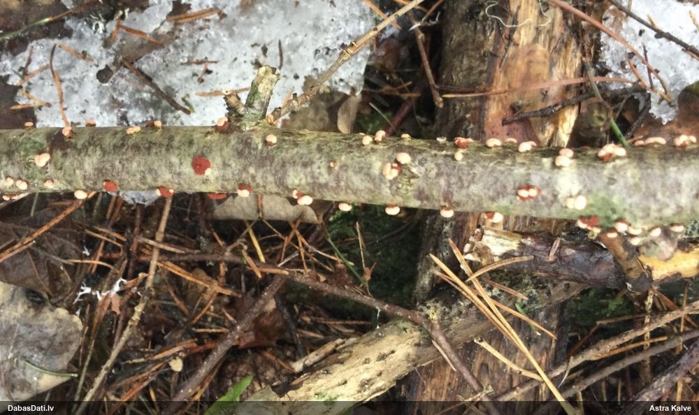 Ja uz beigta koka, tad ticamākā laikam ir B.affinis var. microspora, lai gan tā aug uz mizas. Bet varbūt tieši apakšā gļotsēnēm ir kādi mizas fragmentiņi?