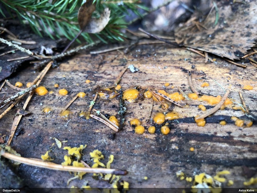 Julitas, šai paņemts paraugs, diezgan izsporojies. Un tai otrai līdzīgajai, kam ieziņots novērojums, arī. Pārliecinājos, ka tiešām egles kritalas. Bet tādu gļotsēņu diezgan daudz, vai uz katras egles kritalas, daudzās vietās stumbram, tagad dzeltenos sporu mākoņus labi redz.