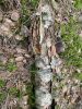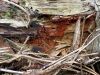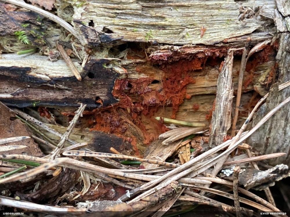 Satrūdējusi kritala mežā, nav dēļi. Iespējams, egle, jauktu koku mežs.