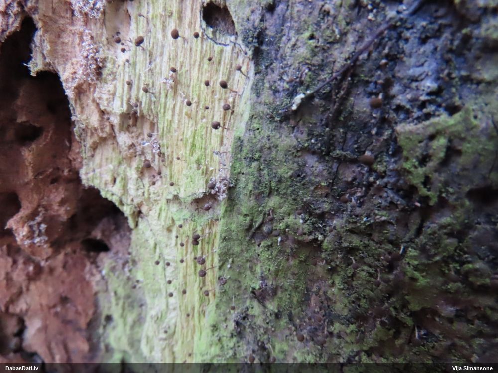 Šobrīd varu iedomāties 2 variantus - melnā plaispika Amaurochaete atra vai parastais gļotpūpēdis Reticularia lycoperdon. Pēc izmēra, augšanas laika un augšanas uz apstrādāta koka atbilst abas.