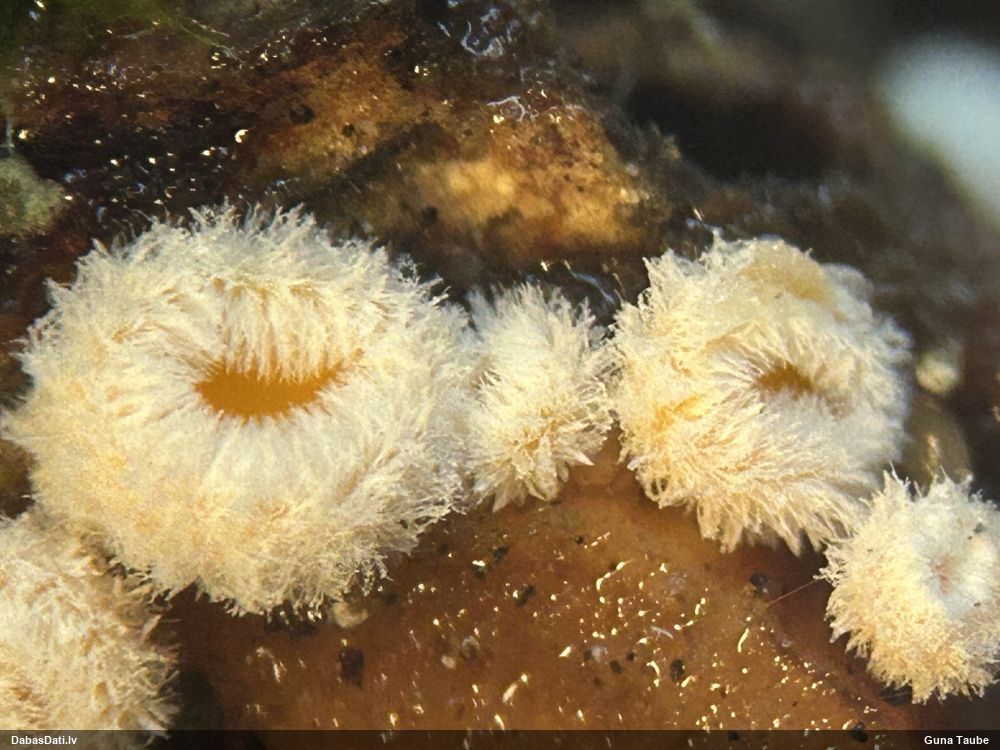 Paldies, Raivo! Ar acu gaišumu man arvien sliktāk, bet mikroskops palīdz. Jā, gribēju teikt, ka paraugam, ja vien nav kāda jutīga atradne, kurai drīkst ievākt tikai mazu gabaliņu, vērts ievākt lielāku gabalu, jo gļotsēnēm patīk kompānija. Un mikroskopa mazajos palielinājumos ar sānu papildus apgaismojumu ir vērts rūpīgi "izstaigāt" visu paraugu. Arī ķērpjus un interesantas sīksēnītes tā var atrast, ko dabā nepamanītu. Ar kriksītēm ir dažādi - pirmās es tā arī tikai citu sugu paraugos pamanīju, bet vēlāk redzēju arī dabā kriskīšu plantācijas - ja to ir daudz, tad var pamanīt jau dabā. Uz sūnām gan ir ekstrēms gadījums, dabā droši nepamanītu, arī eksemplāra noņemšana no sūnas nebija pārāk veiksmīga, tāpēc par noteikšanu mazliet šaubos (sporām mazliet cits tonis). Bet pagaidām citas hipotēzes nav (un konkrētā eksemplāra arī vairs ne).