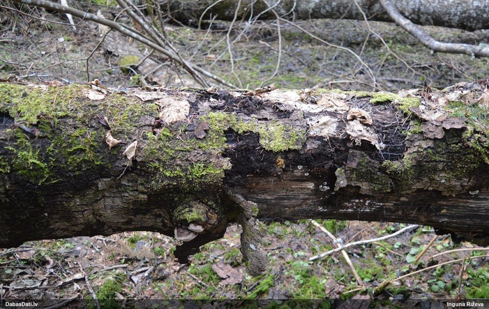 Satrūdējusi kritala mežā, nav dēļi. Iespējams, egle, jauktu koku mežs.