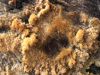 Man pēkšņi radās ideja - vai tur bija nu ļoti mitrs mikroklimats, egle ar melnalksni? Hipotētiski tādas dzeltenas var būt Diachea muscorum. Te bilde ir mazliet līdzīga: https://fr.wikipedia.org/wiki/Fichier:Craterium_muscorum,_Trawscoed,_North_Wales,_Aug_2016_-_Flickr_-_janetgraham84.jpg