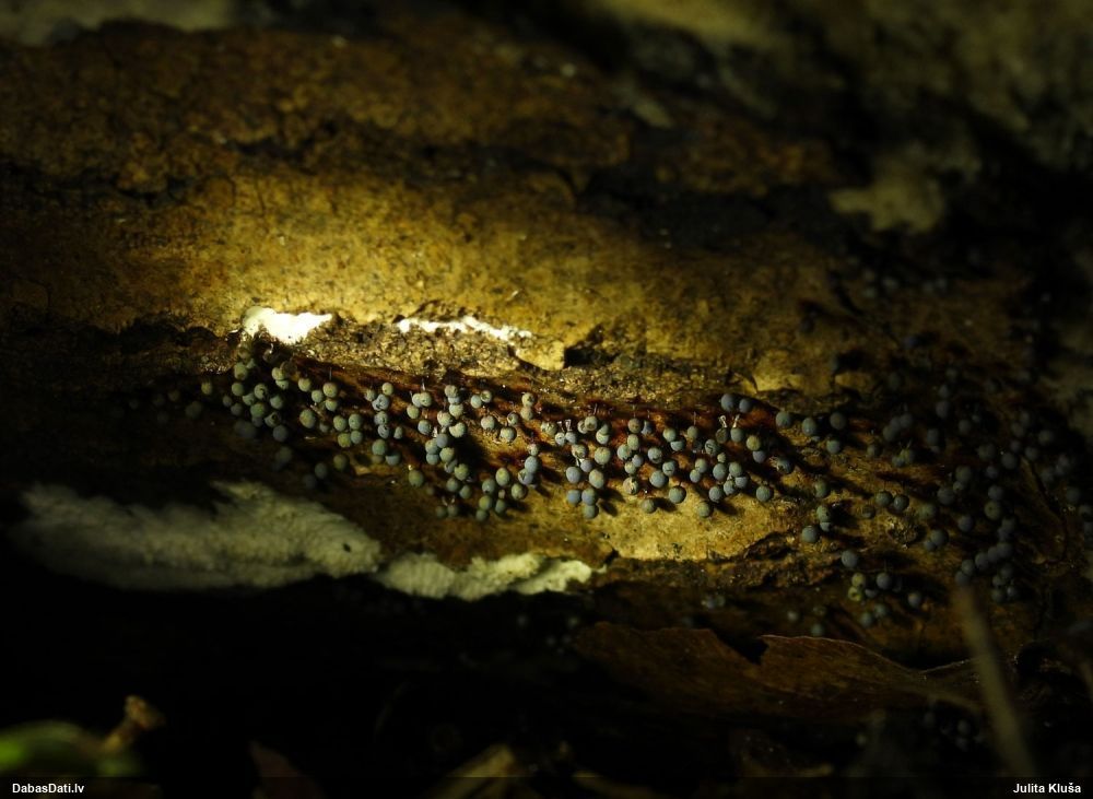 Paldies, Raivo! Ar acu gaišumu man arvien sliktāk, bet mikroskops palīdz. Jā, gribēju teikt, ka paraugam, ja vien nav kāda jutīga atradne, kurai drīkst ievākt tikai mazu gabaliņu, vērts ievākt lielāku gabalu, jo gļotsēnēm patīk kompānija. Un mikroskopa mazajos palielinājumos ar sānu papildus apgaismojumu ir vērts rūpīgi "izstaigāt" visu paraugu. Arī ķērpjus un interesantas sīksēnītes tā var atrast, ko dabā nepamanītu. Ar kriksītēm ir dažādi - pirmās es tā arī tikai citu sugu paraugos pamanīju, bet vēlāk redzēju arī dabā kriskīšu plantācijas - ja to ir daudz, tad var pamanīt jau dabā. Uz sūnām gan ir ekstrēms gadījums, dabā droši nepamanītu, arī eksemplāra noņemšana no sūnas nebija pārāk veiksmīga, tāpēc par noteikšanu mazliet šaubos (sporām mazliet cits tonis). Bet pagaidām citas hipotēzes nav (un konkrētā eksemplāra arī vairs ne).