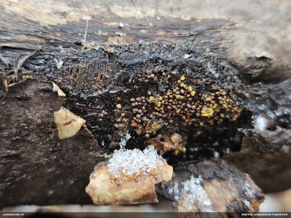 Šobrīd varu iedomāties 2 variantus - melnā plaispika Amaurochaete atra vai parastais gļotpūpēdis Reticularia lycoperdon. Pēc izmēra, augšanas laika un augšanas uz apstrādāta koka atbilst abas.