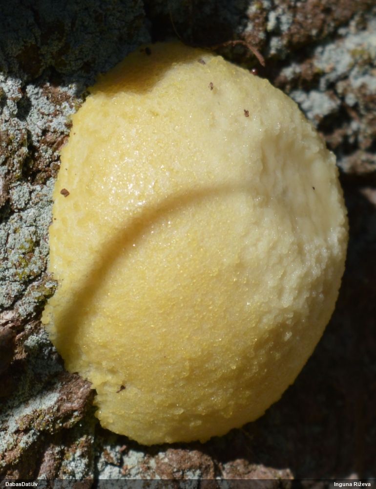 Man pēkšņi radās ideja - vai tur bija nu ļoti mitrs mikroklimats, egle ar melnalksni? Hipotētiski tādas dzeltenas var būt Diachea muscorum. Te bilde ir mazliet līdzīga: https://fr.wikipedia.org/wiki/Fichier:Craterium_muscorum,_Trawscoed,_North_Wales,_Aug_2016_-_Flickr_-_janetgraham84.jpg