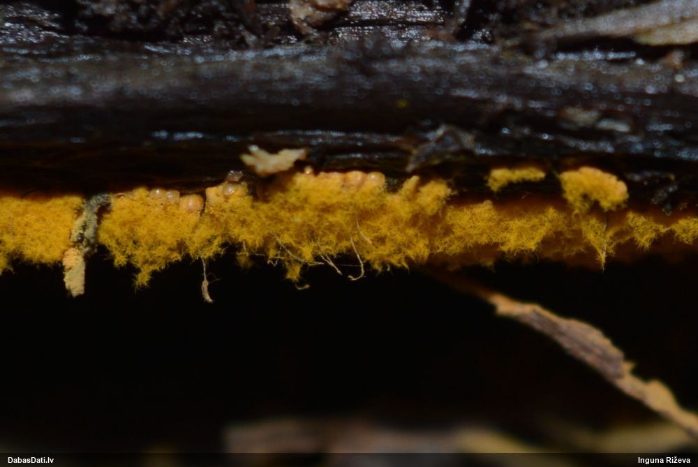Man pēkšņi radās ideja - vai tur bija nu ļoti mitrs mikroklimats, egle ar melnalksni? Hipotētiski tādas dzeltenas var būt Diachea muscorum. Te bilde ir mazliet līdzīga: https://fr.wikipedia.org/wiki/Fichier:Craterium_muscorum,_Trawscoed,_North_Wales,_Aug_2016_-_Flickr_-_janetgraham84.jpg
