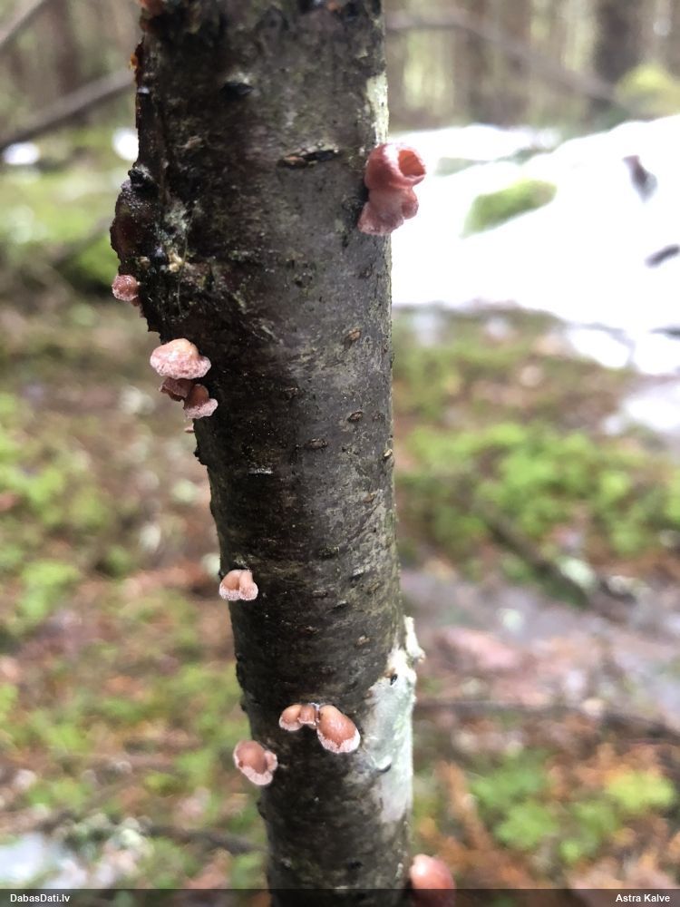 Ja uz beigta koka, tad ticamākā laikam ir B.affinis var. microspora, lai gan tā aug uz mizas. Bet varbūt tieši apakšā gļotsēnēm ir kādi mizas fragmentiņi?