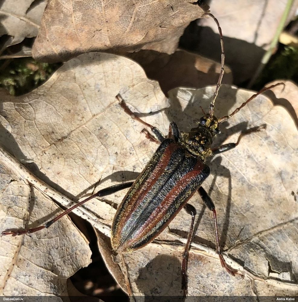 Jāredz tuvāk (kaut vai izkadrēts šis pats attēls) - varbūt tumšā eļļasvabole (Meloe proscarabaeus)