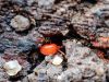 Man pēkšņi radās ideja - vai tur bija nu ļoti mitrs mikroklimats, egle ar melnalksni? Hipotētiski tādas dzeltenas var būt Diachea muscorum. Te bilde ir mazliet līdzīga: https://fr.wikipedia.org/wiki/Fichier:Craterium_muscorum,_Trawscoed,_North_Wales,_Aug_2016_-_Flickr_-_janetgraham84.jpg