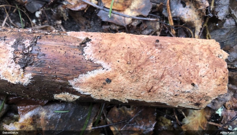 Ja uz beigta koka, tad ticamākā laikam ir B.affinis var. microspora, lai gan tā aug uz mizas. Bet varbūt tieši apakšā gļotsēnēm ir kādi mizas fragmentiņi?