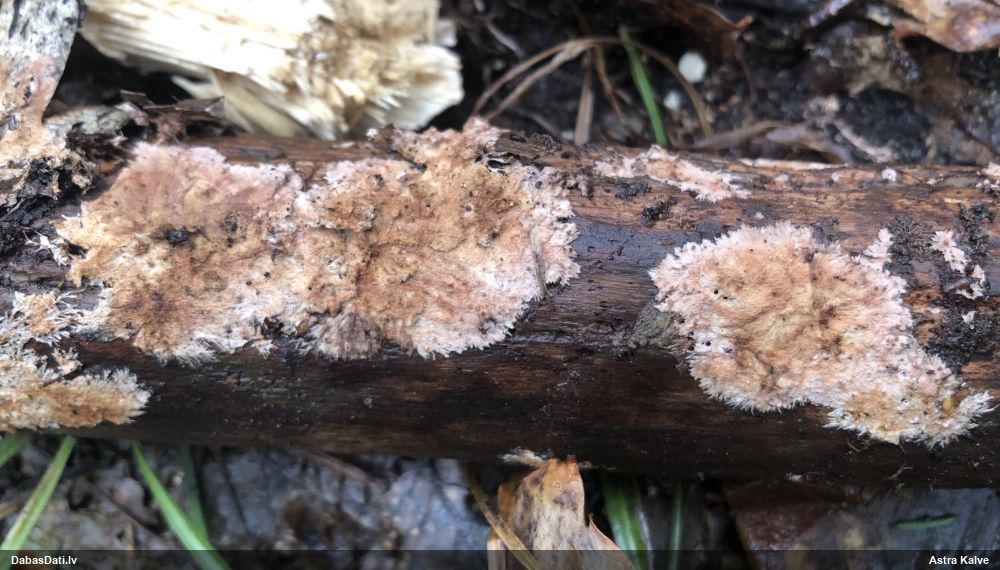 Ja uz beigta koka, tad ticamākā laikam ir B.affinis var. microspora, lai gan tā aug uz mizas. Bet varbūt tieši apakšā gļotsēnēm ir kādi mizas fragmentiņi?